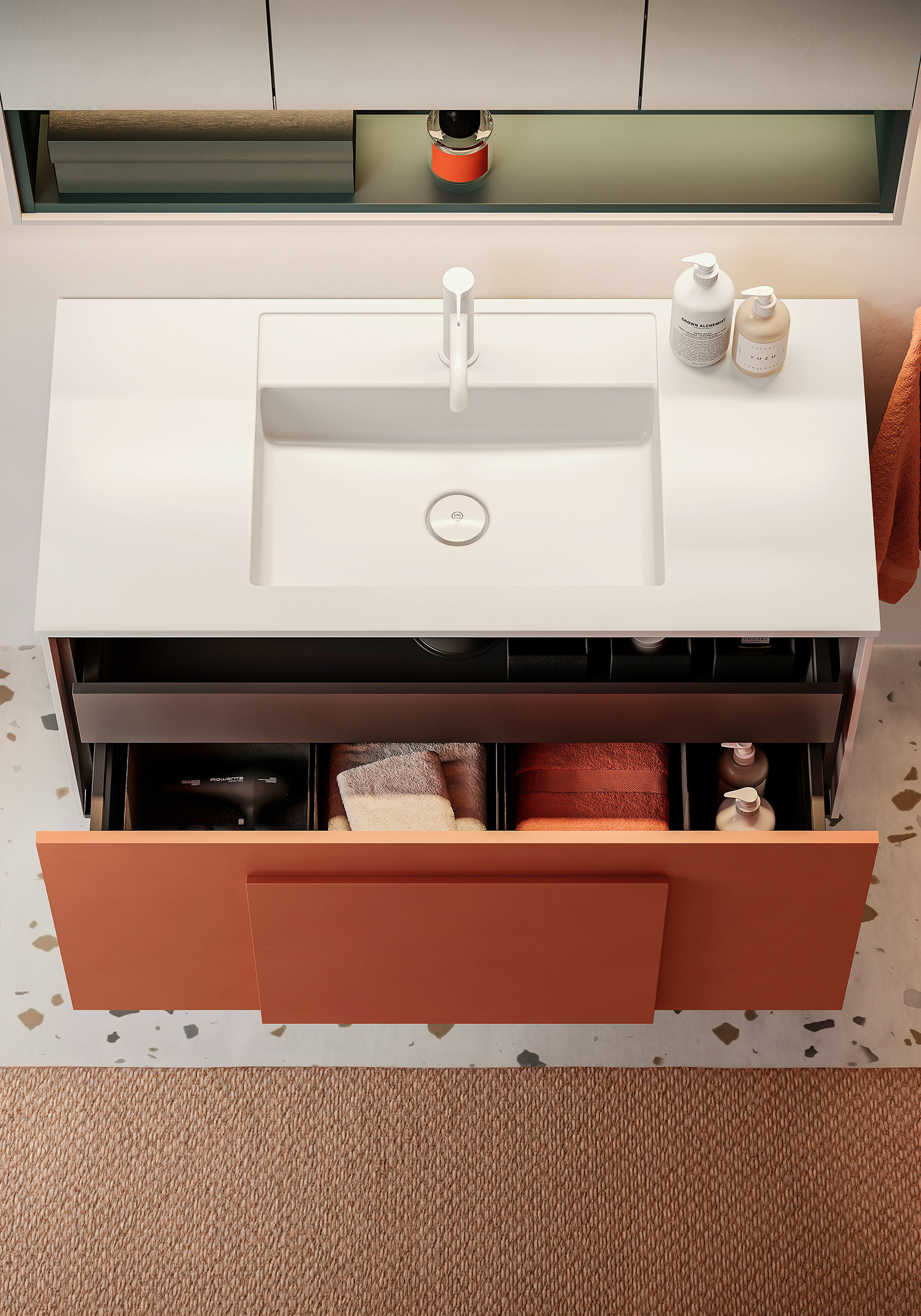 Farbe ist bei Moto integrales Element des Designs. Ob Farbharmonie oder Kontrastprogramm – die Badmöbelkollektion aus dem sys20-Designlinien-Segment zeigt, welche Möglichkeiten in der neuen Farbpalette von burgbad stecken. Moto integriert die miteinander kombinierbaren Basisfarben und Oberflächen in Melamin, Mehrfachlackierung Solid Matt oder Echtholzfurnier und bindet sie durch den Korpusrahmen im Framed Look zusammen. Durch die Option, Fronten und Korpusse (gegen Aufpreis) in jeder Wunschfarbe aus dem RAL-Spektrum fertigen zu lassen, bietet Moto zudem unendliche Möglichkeiten der Raumgestaltung und der Kontextualisierung für ein ganzheitliches Interior Design.